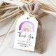Moderna märkre för regnbågsfödelsedagspresent med en vattenfärgad regnbåge i skuggor av lila, brun, och rosa med "Tack" som visas nedan i ett handskrivet svart skript. Anpassa märkrna för regnbåge genom att lägga till födelsedagstjejen eller pojkens namn och ålder. Baksidan av presentens märkre har en motsvarande regnbåge mönster. Märkrna är perfekter för födelsedagsfester, babyduschar och andra evenemang!