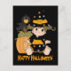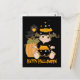 Det här vykortet har en ung, blond häxa som är klädd i en underbar orange och en svart polkattklänning och hatt, med en korven genomborrad vid en pumpa, alla är inställda mot ett skådespel Halloween-bakgrund. Den lilla häxan kommer säkert att ge ansikte ett leende till den lyckliga mottagaren av detta charmkort. Originalteckningar efter återförsäljningsdel.