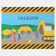 Har en liten pojke som kärlek bygger fordon? Den här filten är perfekt! Filten har en lastbil, cement lastbil och grävmaskin som alla arbetar tillsammans på en vägbyggare. En ung pojke står nära fronten med en stoppskylt som hjälper till att stoppa trafiken. Det finns också säkerhetstrafikkoner för orangen, bakgrundsberg och blå himmel. Avsluta filten med din unge mans första namn.