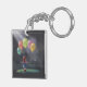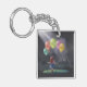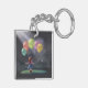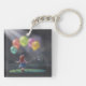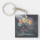 En söt liten flicka som bär en rosa skjorta och blå kjol håller fem färgstarka ballonger. Hon ger en briljant till en mörk värld. I avstånd finns ett grått-byggnad omgivet av dimma och mörk träd och berg.