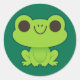 En söt liten grönt groda med stort leende sitter glatt på mörk grönt bakgrund.