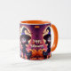 Mugg har en söt liten häxa i en svart dräkt med katter och pumpor på Halloween-natten. Roligtens dekanter och gåva till Halloween! Anpassningsbar.