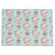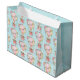 Mönstrad stor presentväska med en snygg design med en illustration av vattenfärg. En luftballong dekorerade med söt rött och rosa blommor. En söt liten vit björn i baby ligger i basket. Ljusblå bakgrund.