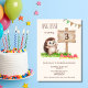Äkta födelsedagsinbjudningar i barn som innehåller en söt, glad häckande, grönt och färgad svamp på golv, party flagga och en träskiva med nummer.
