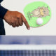 Cute lycklig-leende hamster med jordnöts tecknad pingisracket