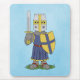 En söt tecknad-riddare i post och underbar hjälm håller sitt svärd högt, redo att försvara sitt slott.