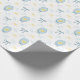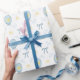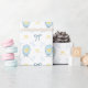 En lekfull, könsneutral babyduschgåva med pappra handritade illustrationer som ett sött gummi anka i ett mjukt blått band ram som är bundet i en båge och bubblor i ett mjukt blått och gult färg.