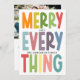 Spread holiday cheer with this colorful “Merry Everything” classic photo holiday card — a modern, joyful, and inclusive way to send warm wishes to family and friends. With a cute, bright, festive design with bold colors and cheerful typography, this holiday card is perfect for celebrating Christmas, Hanukkah, New Year’s, or any winter holiday. The front includes customizable space for your family name and year, making it a personal keepsake your loved ones will treasure. The back offers additional room for a heartfelt custom message and family portrait. This vibrant and unique card brings a playful yet elegant touch to your holiday greetings. Perfect for families, couples, or individuals looking for a modern, inclusive holiday card.