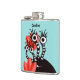 En kolv av personlig av matsäck med svart tecknad med fyra öga på långa, svarta och vita strimlade mattor leende, gömt i röda abstrakter.