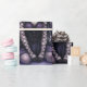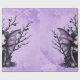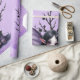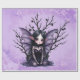 Cute Mörk Fairy med Fladdermus Vingar. En söt, stiliserad mörk med stort, uttrycksfullt ögon och spetsigt öron. Hon har svart hår och har en mörk lila klänning med snöre-upp-uppgifter. Fladdermus-liknande vingar i skuggor av lila sträcker sig från hennes rygg. Bakom henne ligger svart grenar med små, runda bär. Bakgrunden är ett mjukt, lavendelt färg med blommönster som skapar en viskartad och något gotisk atmosfär.