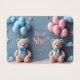Gratulera till ert speciella ögonblick med denna förtjusande nalle-gender, visa inbjudan. Med två fluffiga nallar med pastellblå och rosa ballonger omgivna av drömmoln och stjärnor. Eleganten "Han eller hon?" gör det till perfektens val för babydusch party, gender avslöjar händelser eller firande. En modern, charmerande och tidlös design som gör dina inbjudningar oförglömliga.