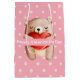 Grattis på Alla hjärtans dag-presentväska med en söt illustration av vattenfärgen. En brun nalle med stort rött hjärta. Ljust gult polka dots på rosa.