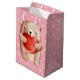 En söt illustration av vattenfärgen. En brun nalle med stort rött hjärta. Ljust gult polka dots på rosa.