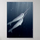 Två valar med grått-fläckar och färgstarka betar simma ihop i en pod under havet vatten mot yta för utandning av luft. Det mörk blått havet med bubblor lyser upp med hjälp av skrynkliga ljusstrålar. En originaldigital grafik.