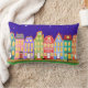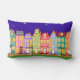 Cute Night Walking Cat Pillow. Underbar för förskolor eller barnrum. Cute tecknad-hus, gatubelysning, himlar med stjärnor och svart katt som går ner på gatan. Färgämnen och roligt: blått, grönt, ljusblått, orange, rosa, gult.
