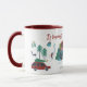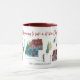 Mugg-gåvan "det kommer att se ut som jul" i stil med vår moderna julklapp och grönt Alpine skidåkning ger en mysigt helgby med skidåkning av människor och barn under vintern roligt till jul i Helgdag med vit snö inbjudan. Originalteckningar av Caroline Bonne Müller