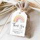Moderna märkre för regnbågsfödelsedagsgåva med en vattenfärgad regnbåge i skuggor av gult, rosa, korallrött och blått med "Tack" som visas nedan i ett handskrivet svart skript. Anpassa märkrna för regnbåge genom att lägga till födelsedagstjejen eller pojkens namn och ålder. Baksidan av presentens märkre har en matchande regnbåge mönster. Märkrna är perfekter för födelsedagsfester, babyduschar och andra evenemang!