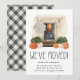 Halloween-meddelanden om flytta med en söt frontdörr som dekoreras med ett spöke, jack-o-lyktor, pumpor, ljus och spindlar. Anpassa det söta Halloween-flyttan-meddelandet med ditt namn och adress i modern svart skrift. Flyttans tillkännagivande går tillbaka till en kräm och en svart vattenfärg som bufflar som pläderar mönster.