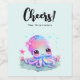 Flaska-etiketter med en bild av en söt giftig bläckfisk med en blomma på huvudet. Stora, ljusa ögon och ett vänligt ansikte.