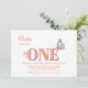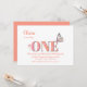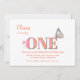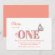 Söt Peach och rosa 1:a födelsedag inbjudan med persiko-/mjuk orange och nummer ONE som visas i en mjuk rosa med persikofärgning och dekoreras med rosa blommor, tillsammans med en vacker mjuk fjärilsmusslare sitta på E.