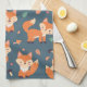 En kökshandduk med en mönster tillverkad med söta och lycklig orange rävar. Mörk grönt bakgrund. Lite svampar och löv var häpnadsväckande.