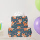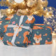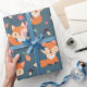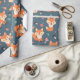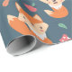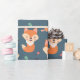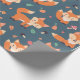 Omslagning papper med en mönster gjord med söta och lycklig orange rävar. Mörk grönt bakgrund. Lite svampar och löv var häpnadsväckande.