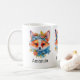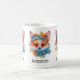 Ett mugg med en illustration av ett ädelt räv porträtt med blå och orange blommigt krona och halsband.