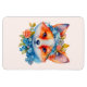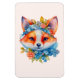 Flexibel magnet med en illustration av ett vidsträckt räv porträtt med en blå och orange blommigt krona och krage.