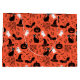 Visar pumpor, spöken, häxor, fladdermöss och spindelnät i ett sömlöst mönster. Svarta och vita Halloween-objekt på orangens bakgrund. Cute, coola och roligt mönster för Halloween helgdag, party och dekorationer. För barn och vuxnor.