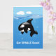 Tecknad knubbig Orca val med ett litet vitt hjärta nära svan. Kortets framsida lyder: Hämta WHALE Soon!