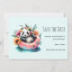 Spara datumkortet med en bra summeringsbild. En vattenfärgsdesign med svart och vit panda sitta i ett simmande ring i vatten. Omgiven av söt vilda blommor. En fullkomligt kylig björn.