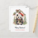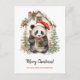Cute Panda Santa House Greeting Card. Kawaii stil, svart, vit och röd färg panda, bär med julhatt och en gåva framför julhuset. Personlig.