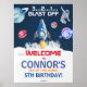 Välkommen gästerna i party med en förtjusande personlig poster. Den här designen har astronaut, raketplattor och färgstarka fraktaser. Anpassa den här produkten genom att lägga till barnets namn, ålder och händelsedatum. Perfekt för en pojkes födelsedagsfest.