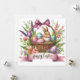 En korgare basket försedd med färgstarka dekorerade ägg och en söt brunt sitta inuti. Basket är omgivet av vibrerande vår blommor såsom tulpaner, lavender och andra blommar som skapar en glad och festlig atmosfär. Ett rosa band med en båge dekorerar basket och en banderoll vid grund läser "Glad påsk" i elegantens skript.