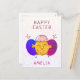 Cute Påsk Chick och Eggs Glad påsk Helgdag-vykort. Cute chick med krackat äggskal på huvudet och ett blått och ett lila Påskägg. Lägg i namn och skriv i kortet eller radera det.