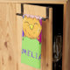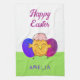 Kökshandduk för Cute Påsk Chick och Eggs Glad påsk Helgdag. Cute chick med krackat äggskal på huvudet och ett blått och ett lila Påskägg.