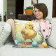 Fira Påsk och vår lyckliga ögonblick med denna söta lilla chick som står nära dekorerade ägg.