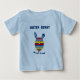 En söt Påskhare i form av ett Påskägg, dekorerad med rand, zigager och fläckar i rött, gult och blått.