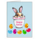 Cute Påskhare i en växtdepås och färgstarka Påskägg på ljusblått bakgrundskort. Text kan vara personlig för födelsedag. Påskhare symboliserar förnyelse, överflöd och bra förmögenhet.