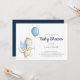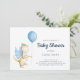 Den blåa och vita babyduschinbjudan med en sagoldragon som håller en blå ballong. Underbar för könsneutralt eller pojkars babyduschfantasi firande. Illustrerad och designad av Patricia Alvarez.