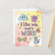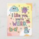 A charming and super-cute design featuring the phrase "I like you, you're weird" surrounded by adorable doodle elements. The soft pastel background complements the whimsical characters, including a happy cloud, a purple winged monster, a bowtie-wearing cat, a heart teacup, and stylish star-filled glasses. Perfect for expressing affection to a quirky friend, partner, or family member.