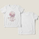 This watercolor illustration shows an adorable pastel jellyfish with a soft rounded shape and a gentle smiling expression. The translucent body is painted in delicate blush and lavender tones, while the flowing tentacles feature subtle swirl details that add movement and charm.