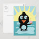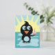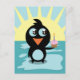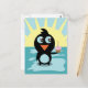 Cute penguin som står på en isplatta framför ett stigning sol som håller ett ljus.