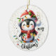 Here's a cute ceramic Christmas ornament that can be customized with a child's name, and come from grandparents or Mom and Dad. On the front is a happy little penguin dressed in a scarf and Santa Claus hat. He has managed to get himself wrapped up in a string of Holiday tree lights. A gold confetti background and the script text "Merry Christmas" completes the design. The back has a buffalo plaid "Merry Christmas", and three text fields for you to customize.