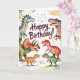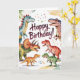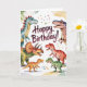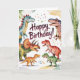I den här snygga vattenfärgsdesignen ingår vattenfärgsdinosaurier i olika gröntar, blyfärger och nyanser. Denna utformning av dinosauriefödelsedagskort innehåller också frasen "Grattis på födelsedagen!" på kortets framsida. För personalisering innehåller kortets insida en ställe som lägger till ett namn samt frasen "Hoppas att din födelsedag är T-riffic!" (Hoppas att din födelsedag är T-riffic!).