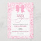 At the center, a charming pink bow adds a sweet touch, perfectly complementing the classic typography and refined layout. The combination of soft florals and balanced spacing gives this invitation a light, airy feel—ideal for spring and summer baby showers, garden parties, brunch celebrations, or elegant indoor gatherings.