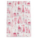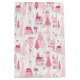 A monochrome pink Christmas village with a snowy white background, dotted with pink hearts and smiling snowmen.