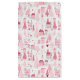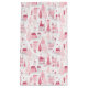 A monochrome pink Christmas village with a snowy white background, dotted with pink hearts and smiling snowmen.