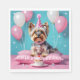 This birthday party paper napkin has a c cute Yorkie with a pink birthday hat, a cupcake and some diamond and balloons bling.