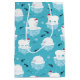 En julklapp med en söt julklapp mönster med en polar som ger isbjörnar som flyter is med röda julhattar. Lilla igloos, snöflingor och fisk runt dessa vackra polar bär kylande på vatten. Ljusblå bakgrund. Utformning av helgdag och finhet.